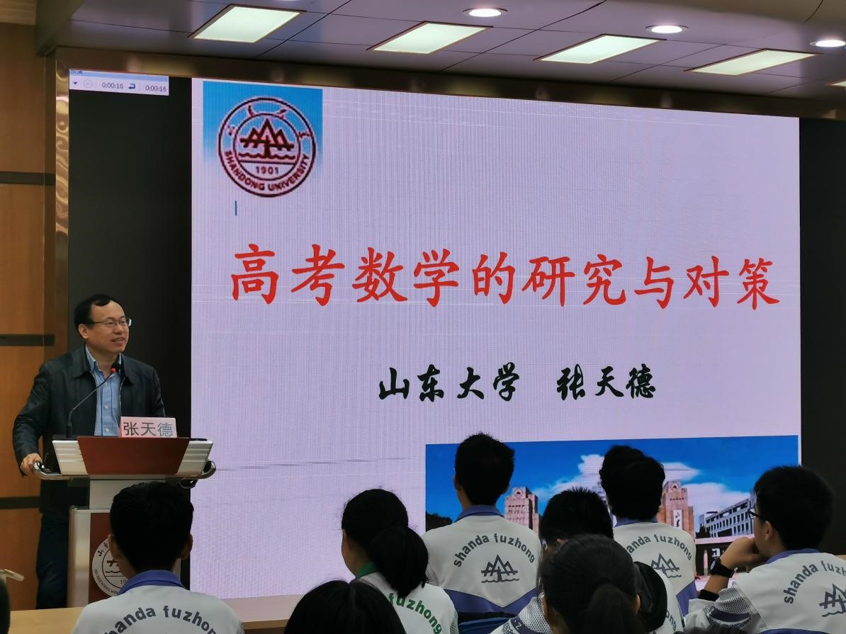 五位老师被山大附中聘为“济南山大实验学校与beat365在线体育官网登录入口联合育人项目教授导师”。最后张天德老师为学子们带来一场专题讲座“高考数学的研究与对策”,对历年高考中的数学试题进行了分析、总结与指导,对改革后高考中的数学试题进行了探索、分析和预测,并跟现场的学子们进行互动。张老师的风趣幽默一次次将演讲推向了高潮,掌声不断。