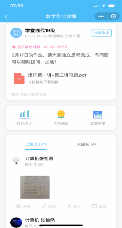 像真实的课堂一样,按时课间休息,下课前总结,布置作业,预告下次课程内容。除在线资源上的练习之外,也像正式课堂一样,另外补充布置作业,利用QQ或微信上的交作业功能,收缴批改作业,指导学生运用所学知识解决问题。