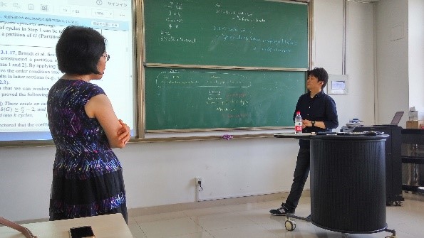 此次报告内容丰富,Shuya Chiba给我们介绍了各种度条件,以及独立集大小和连通度之间的关系,使得我们更好的了解含有哈密尔顿圈以及恰好k个圈的2-因子的图的结构性质。在提问环节,与会老师学生积极提问,Shuya Chiba都认真解答。会后,Shuya Chiba,老师以及同学们均表示学到了很多,受益匪浅。