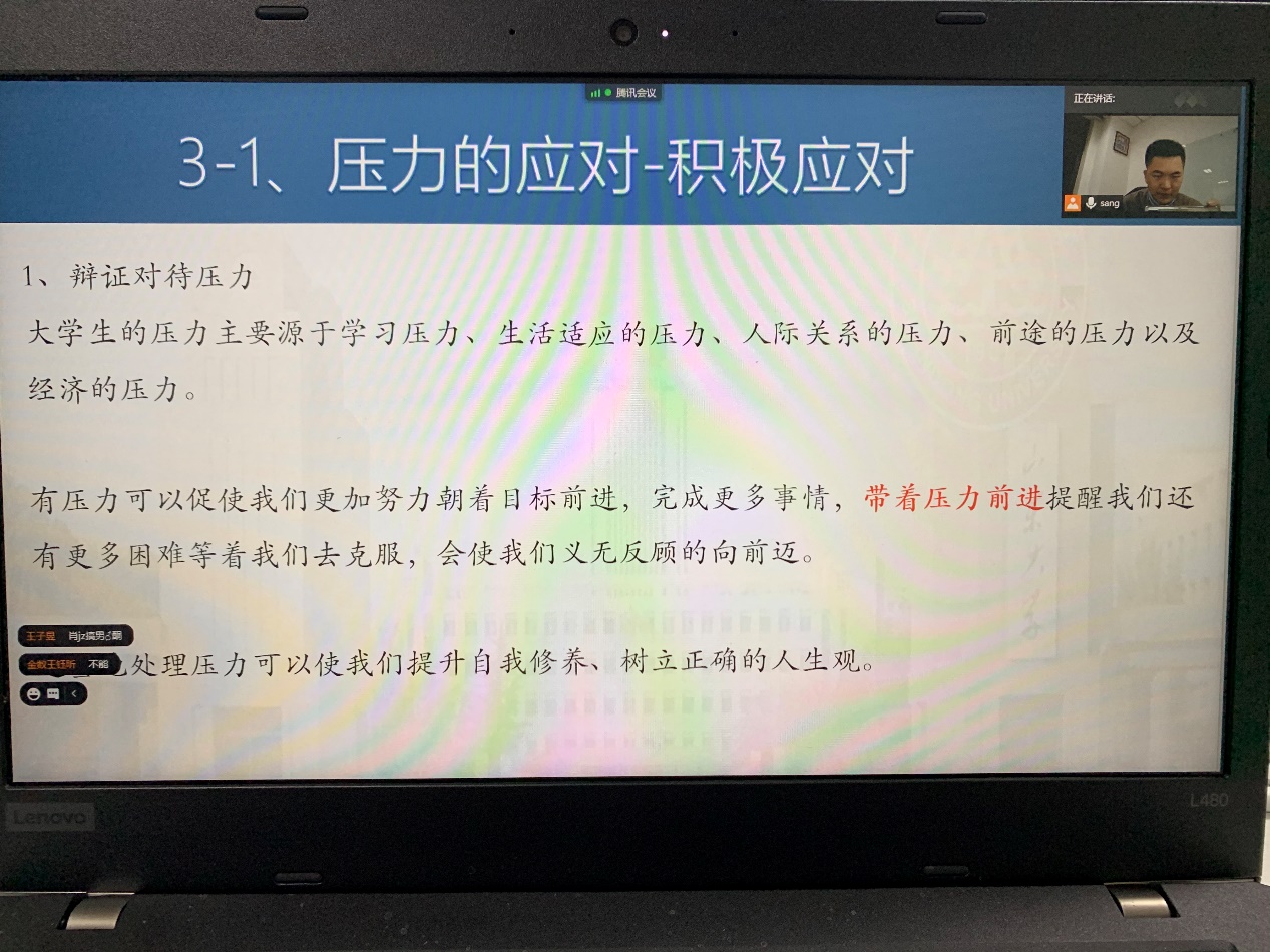 讲座首先介绍了关于压力的数据调查、什么是压力、压力反应的三阶段、反应方式及压力源,并进行了有趣的压力测试环节。接着结合大学生活适应讲解了大学生常见的压力,并对纾解压力给予方法指导,还与参会同学们就宿舍生活和情感交流方面问题进行了交流。最后为同学们未来规划指明了方向。本次讲座令大家受益颇丰,在同学们热烈的线上互动中圆满结束。
