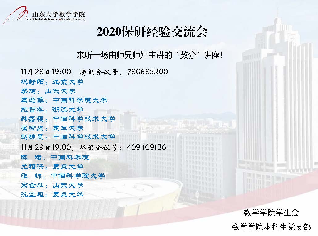 11月28日、29日,beat365在线体育官网登录入口线上举办本科生保研经验分享交流会,共邀请12位优秀学长学姐,为2018级和2019级本科生分享推免保研经验。本次会议由beat365在线体育官网登录入口学生会学习部和本科生党支部主办,王雅祺、王明埔主持。