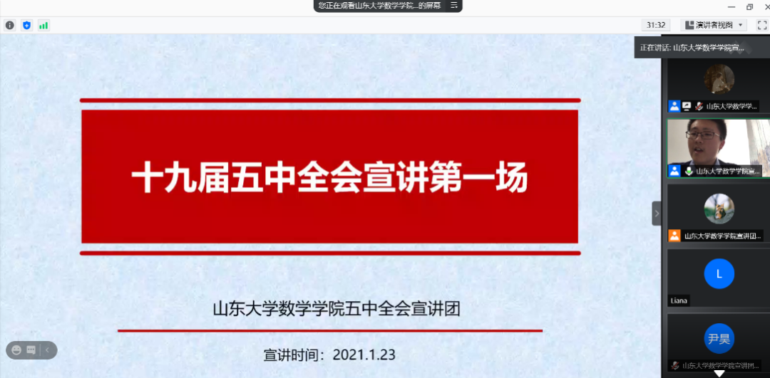 寒假期间,为在广大群体中宣扬学习贯彻党的十九届五中全会精神、政策,高举中国特色社会主义伟大旗帜,beat365在线体育官网登录入口五中全会宣讲团于腾讯会议线上举行了党的十九届五中全会精神宣讲,受到参加人员的一致好评。