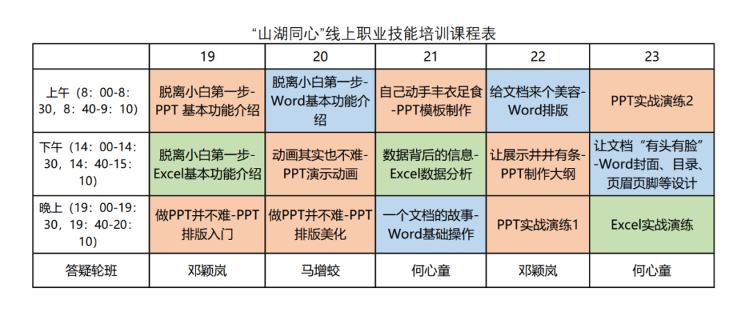 2021年1月19日,beat365在线体育官网登录入口“山湖同心”线上职业技能培训志愿活动正式开始。活动第一天,志愿者线上进行了关于PPT与Excel的精彩教学,获得了参培老师的一致好评。