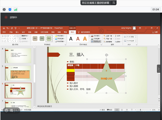 2021年1月19日上午八点,王童舒同学主讲了第一课——PPT 基本功能介绍,本次线上培训正式开始。王童舒同学表述清晰,思路明确,首先介绍和演示了菜单栏、视图区、编辑区、状态栏中常用的功能,如新建幻灯片、调节幻灯片顺序、选择合适的主题模板等,后有针对性地对工具栏涵盖的功能进行了讲解。在对工具栏的讲解中,又重点对文字和段落设置、切换、插入图片、表格、视频等具体功能进行了演示,以求参与者更直观的理解每步操作。在王童舒看来,本次课程是PowerPoint入门系列的初级课程,意图让部分没有任何基础的参与者也能尽量全面地掌握PowerPoint的基本功能,授课思路是通过对PowerPoint的界面进行介绍进而引出相应的功能。通过上午的课程,志愿者们小试牛刀,对本次活动提高了信心。