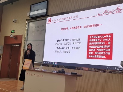 随后,本科生党支部的贺烨和赵洋给同学们讲解了《中国共产党简史》中的“中国特色社会主义进入新时代”部分。贺烨主要介绍了进入新时代,党在经济建设、全面深化改革、民主法治建设、思想文化建设、人民生活、生态文明建设、强军兴军、港澳台工作、全方位外交布局、全面从严治党等方面取得的巨大成果,以及我国社会主要矛盾的变化这一历史性变革,还有中华民族进入强起来的新时代的内涵与意义。赵洋则为同学们介绍了习近平新时代中国特色社会主义思想的核心要义和丰富内涵,与坚持和发展中国特色社会主义的基本方略,还有马克思主义中国化最新成果和新时代的精神旗帜以及实现中华民族伟大复兴的行动指南。