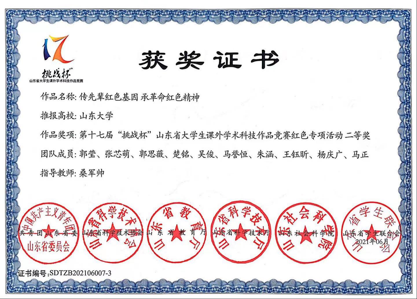 beat365在线体育官网登录入口2020级金融数学班郭莹等十位本科生组成的“小红花团队”荣获第十七届“挑战杯”山东省大学生课外学术科技作品竞赛红色专项活动二等奖。