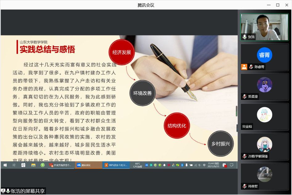 9月23日下午,beat365在线体育官网登录入口在线上开展了暑期社会实践结项答辩与总结交流会。本次会议由beat365在线体育官网登录入口学生会社实部杨合泰主持,团委老师郑柔澄、桑军帅、毛洁玲、宋金灿及各班团支书担任评委,共有8支社会实践团队参加结项答辩,15位同学参加优秀个人评选答辩。