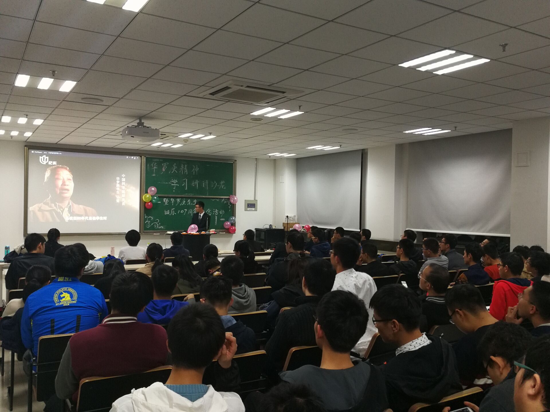 活动伊始,主持人杨博涵播放了有关华罗庚先生传奇一生的简略的纪录片,使与会人员对华罗庚先生有了大致的了解。随后,由刘昕彦具体介绍了华罗庚先生从儿童时期到在东京病逝的详细事迹。介绍结束后,由15级两位优秀的学长分别分享了自己的学习经验:黄泰榕,15级基地班学生兼华罗庚协会会长,给大家提了不要只是为了绩点学习的建议,他提倡大家要广泛学习,不能仅限于课堂上老师讲解的内容。他鼓励大家积极的参加科创活动,并分享了自己参加科创活动的经历与心得。单嘉伟,15级基地班总绩点第二的优秀学长,分享了自己用通俗的思路理解数学概念、数学问题的独特的方法,同时他也鼓励大家积极地参加创新型学术活动。
