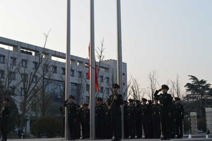 六点十五分,迎着清晨的和煦的微风,同学们在图书馆前列队集合完毕,庄严等待国旗班的到来。迈着着掷地有声的步伐,英姿飒爽的国旗班正式步入了升旗仪式现场。伴随着几声响亮的口令,升旗手、护旗手、持枪方队依次就位,升旗仪式正式开始。顿时,仪式现场气氛庄严万分。