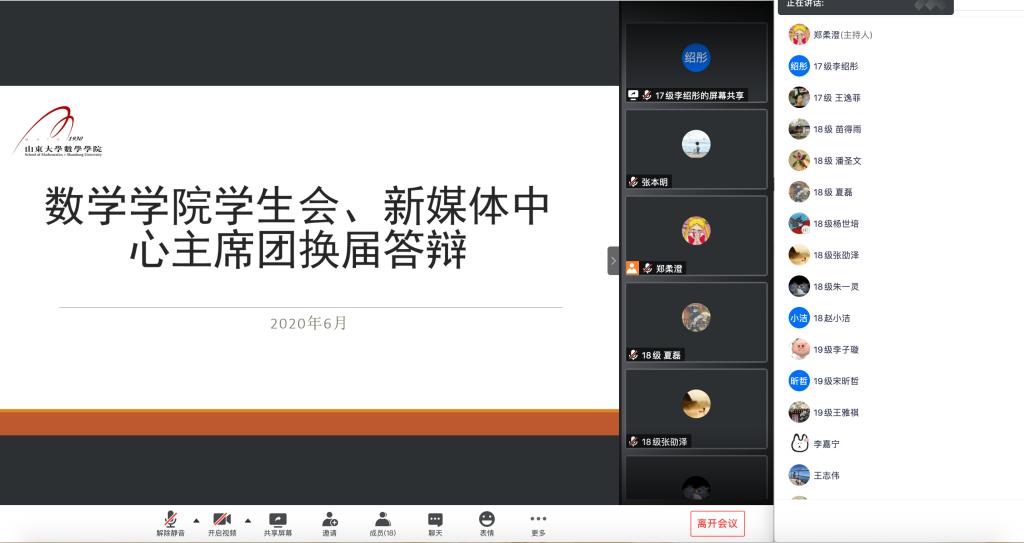 2020年6月13日下午2:30,beat365在线体育官网登录入口学生会、新媒体中心举办主席团换届线上答辩会。beat365在线体育官网登录入口党委副书记路云生,班主任老师王志伟,团委老师郑柔澄、张本明及现任主席团同学们担任评委,10名同学参加答辩,部分同学观摩学习。