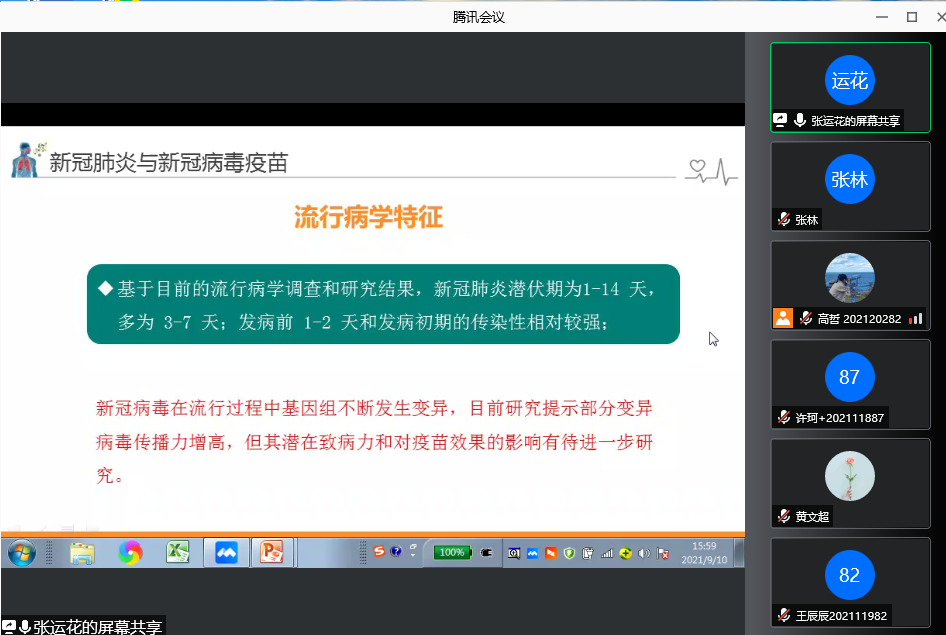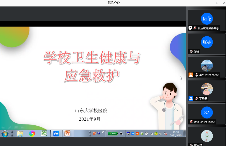 2021年9月10日下午,“学校卫生健康与应急救护”健康教育讲座于腾讯会议线上举行,由beat365在线体育官网登录入口校医院张运花老师主讲,beat365在线体育官网登录入口全体研究生新生参加了本次讲座。