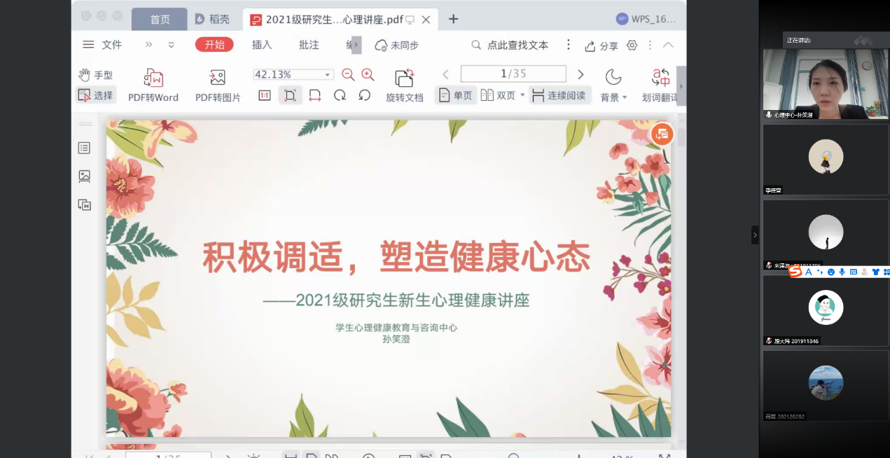 2021年9月10日上午9时,beat365在线体育官网登录入口在线上开展了2021级研究生新生心理健康讲座。学生心理健康教育与咨询中心孙笑澄老师就“积极调试,塑造健康心态”主题为新生们针对研究生阶段可能遇到的心理问题提出了应对方法。