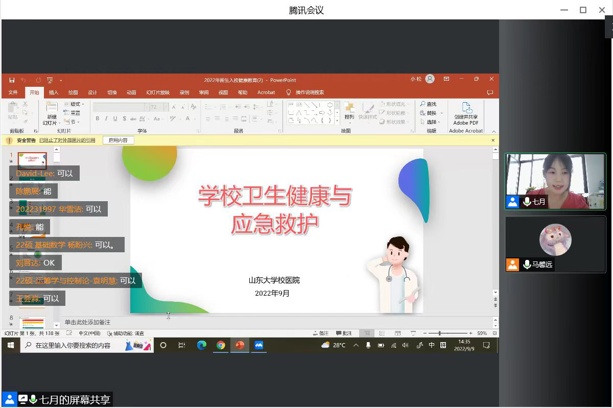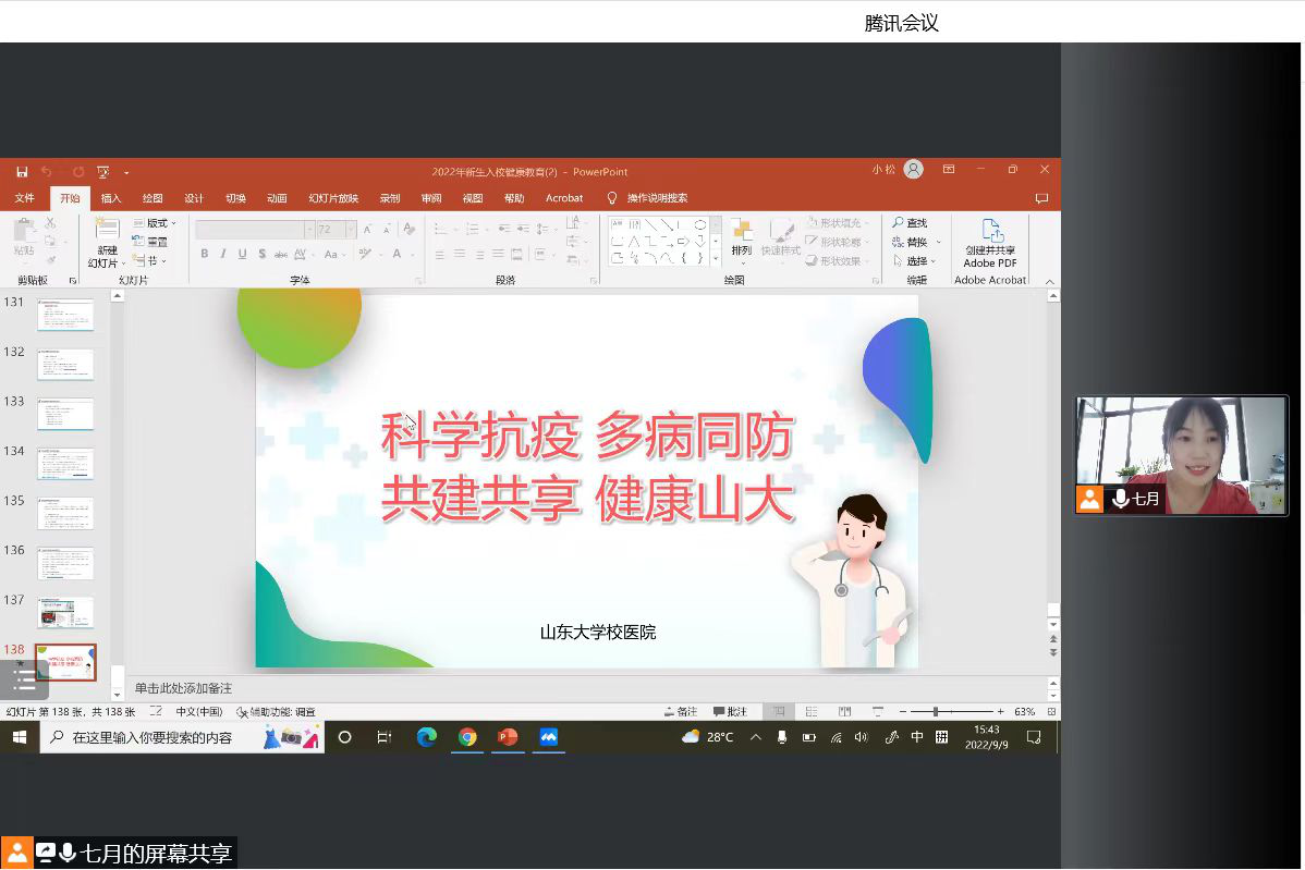 入学健康教育课是每位新生的必修课,为了让各位新生树立健康理念,做好自己健康的第一责任人,beat365在线体育官网登录入口于2022年9月9日下午举办健康教育讲座。讲座由beat365在线体育官网登录入口校医院张医生主讲,beat365在线体育官网登录入口全体研究生新生参加。