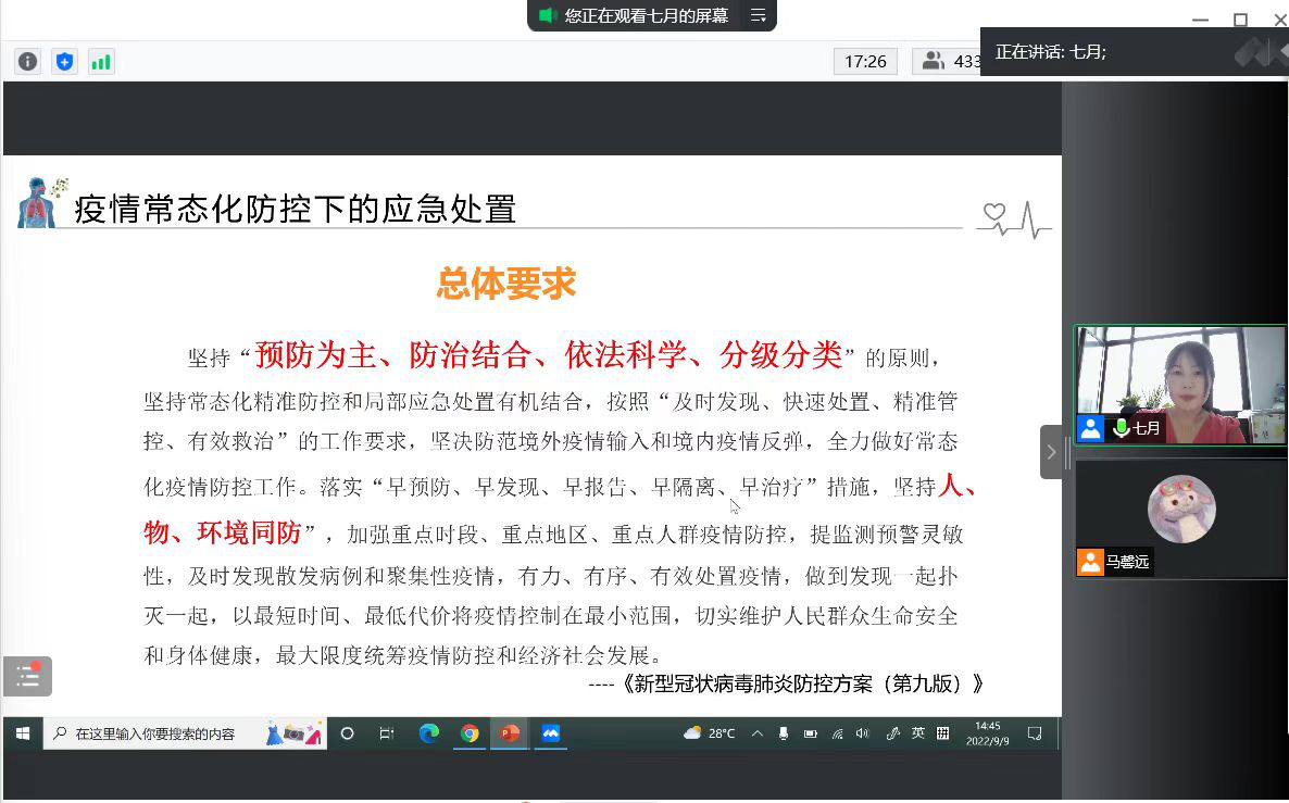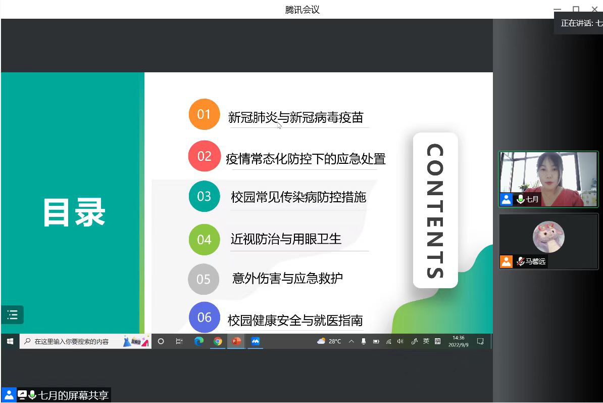 本次讲座为我们介绍了新冠病毒肺炎的病原学特点、临床表现等以及公民防疫基本行为准则,接种疫苗的禁忌、注意事项等知识;提出了疫情常态化防控下的应急处理方法和校园常见传染病防控措施,以及校园常见传染病类型、流行病学特点以及日常防控措施。同时张老师还向我们展示了眼睛的重要性以及如何正确保护眼睛。最后,张老师强调了校园健康安全与就医指南,向我们讲解了如何准确应对可能出现的突发应急事件。