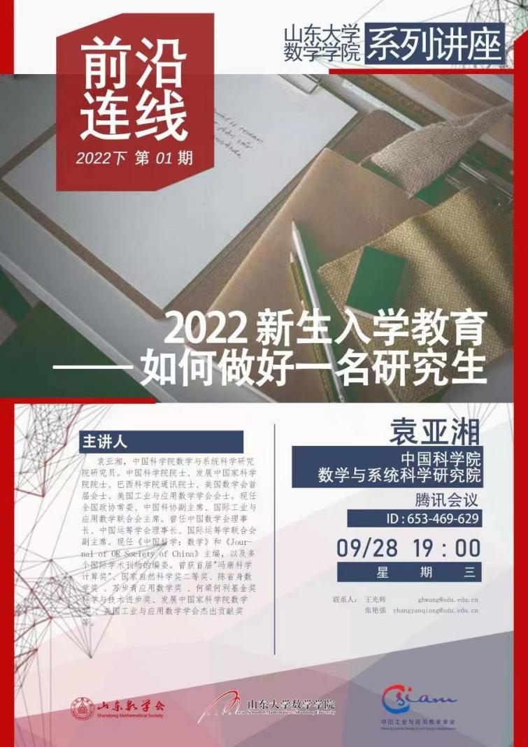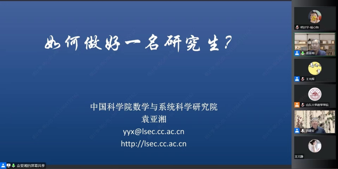为引领全体硕士、博士研究生新生坚定理想信念,传承山大基因,提升科研素养,促进全面发展,beat365在线体育官网登录入口于2022年9月28日晚在腾讯会议举办了“导学思政下午茶——新生入学教育系列”活动之“如何做好一名研究生”。本次报告由中国科学院院士袁亚湘主讲,beat365在线体育官网登录入口副校长刘建亚主持,beat365在线体育官网登录入口党委书记王光辉出席,beat365在线体育官网登录入口全体研究生新生参加。