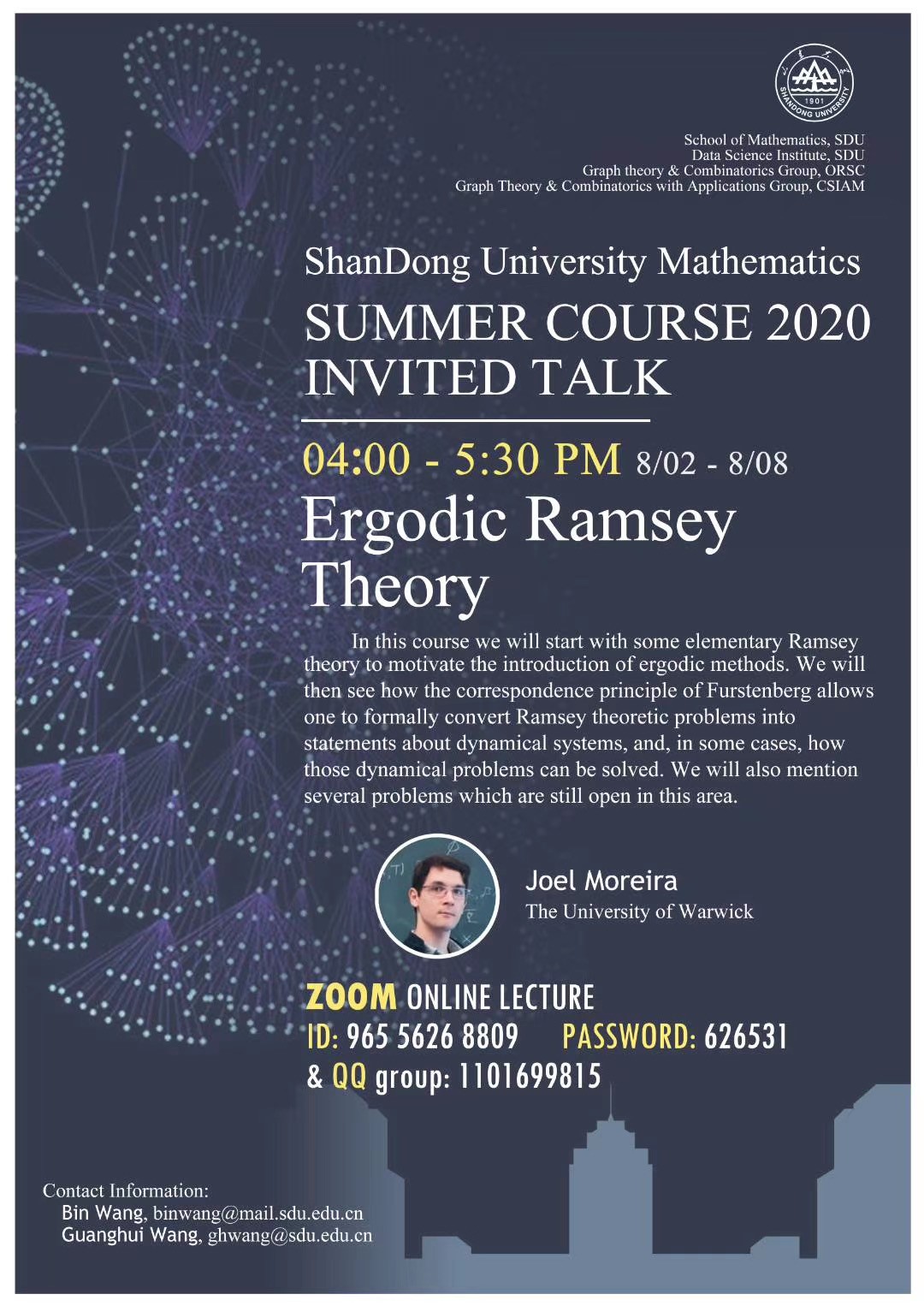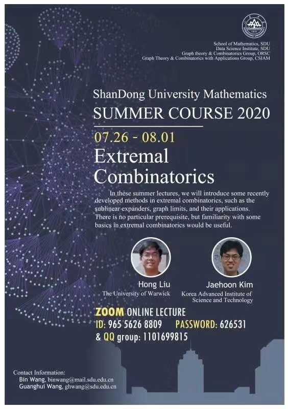 为拓宽学生的国际视野,促进学术交流,beat365在线体育官网登录入口于2020年7月26日-8月8日成功举办了暑期学校特色国际项目“Extremal Combinatorics”。本次暑期学校秉承“精品化、国际化、创新型、开放式”的理念,积极探索暑期线上教学模式,让身在全球各地的师生相聚云端,吸引了来自北京大学、南开大学、中国科技大学等国内知名高校以及来自韩国、英国、巴西、日本、美国等国家的青年学者、学生共300余人参加,其中包括来自巴西圣保罗大学的刘小川、日本东北大学的Masato Mimura、韩国梨花女子大学的Younjin Kim等青年学者。