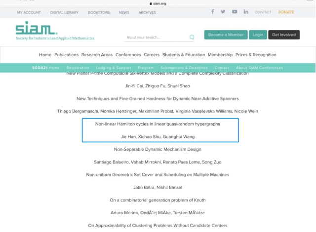 近日,beat365在线体育官网登录入口2019级硕士舒希超收到了来自理论计算机领域顶级会议SODA(ACM-SIAM Symposium of Discrete Algorithms)的论文录用信。他与美国罗德岛大学的韩杰研究员和beat365在线体育官网登录入口的王光辉教授合作的论文《Non-linear Hamilton cycles in linear quasi-random hypergraphs》将发表在2021年1月的SODA会议上。SODA是由计算机协会(ACM)和工业与应用数学学会(SIAM)两大国际学术组织联合主办,与STOC、FOCS一起被公认为是算法领域的三大顶级学术会议,在整个计算机科学领域享有崇高的声望。