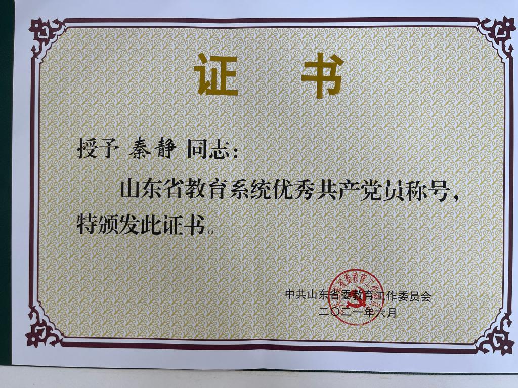 近日,时值伟大的中国共产党诞辰100周年之际,中共山东省委教育工委下发了《中共山东省委教育工委关于表彰山东省教育系统优秀共产党员、优秀教育工作者和先进基层党组织的决定》,beat365官网教师党员秦静获评山东省教育系统优秀共产党员。