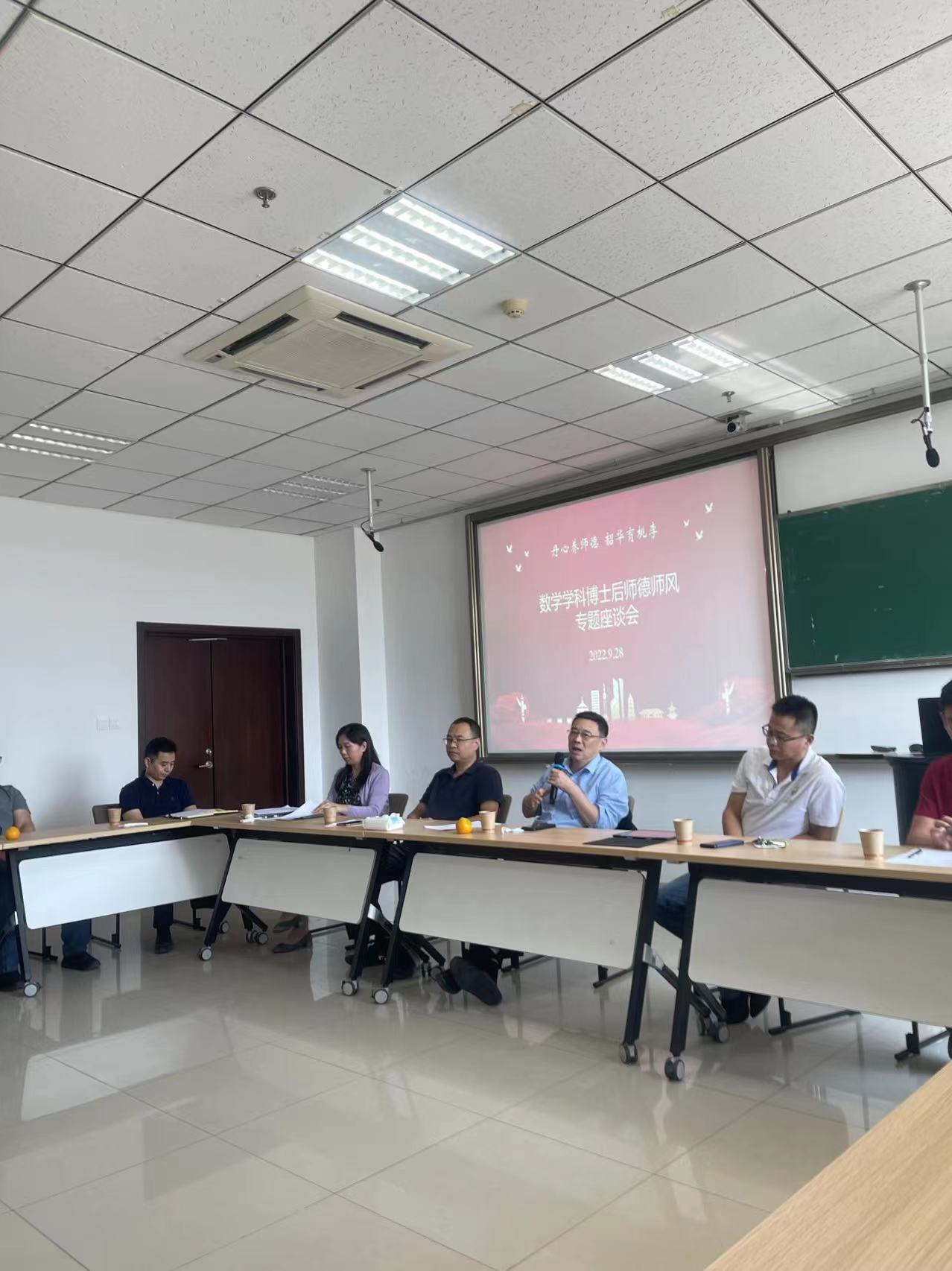 2022年9月28日,beat365在线体育官网登录入口在知新楼举办“韶华育桃李,丹心养师魂”工作坊系列活动——数学学科博士后师德师风专题座谈会。副校长、院长吴臻、党委书记王光辉、常务副院长胡锡俊和学院全体领导班子出席座谈会,学科共20余名数学和统计学流动站的博士后与工作人员参加了座谈。