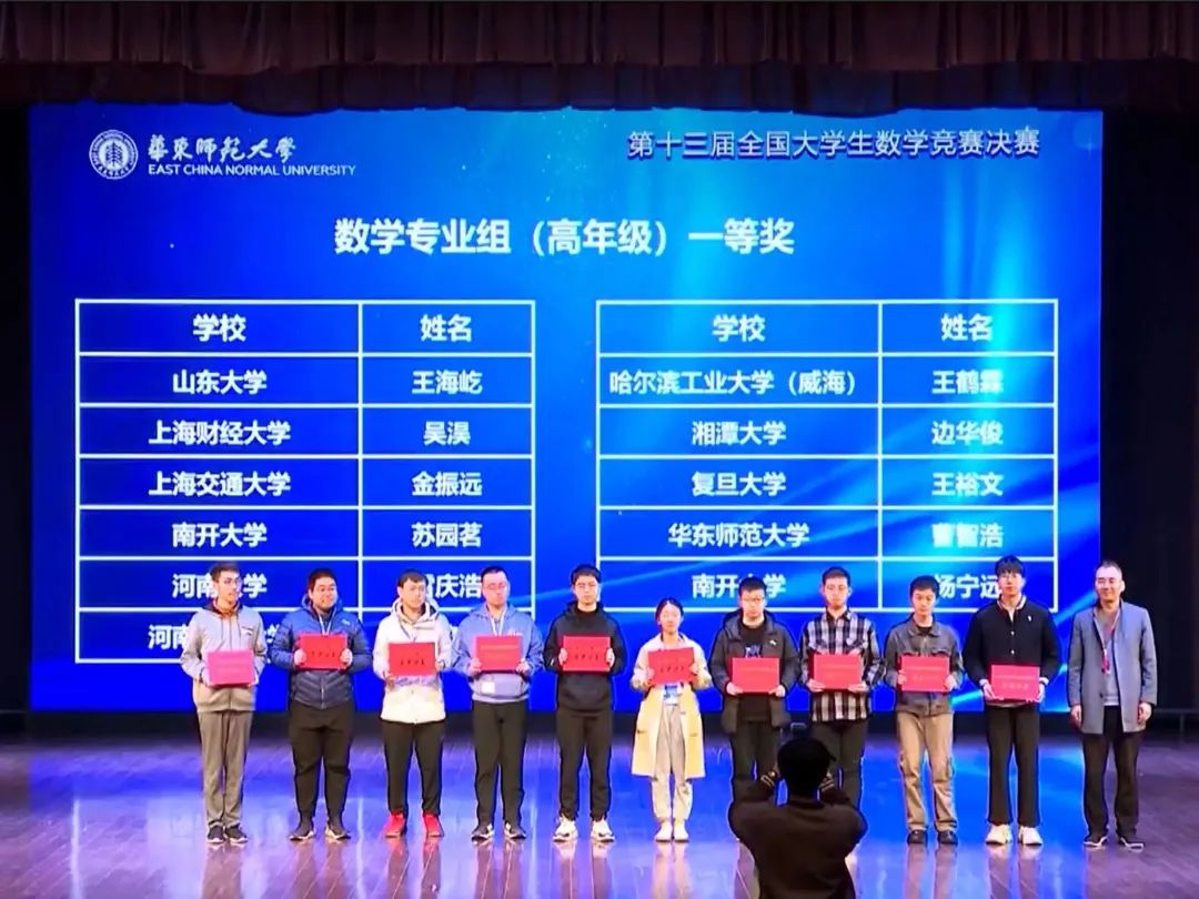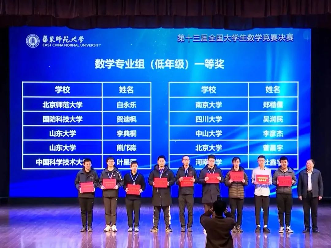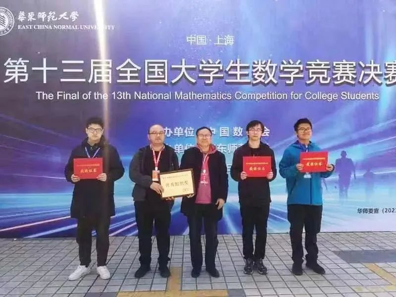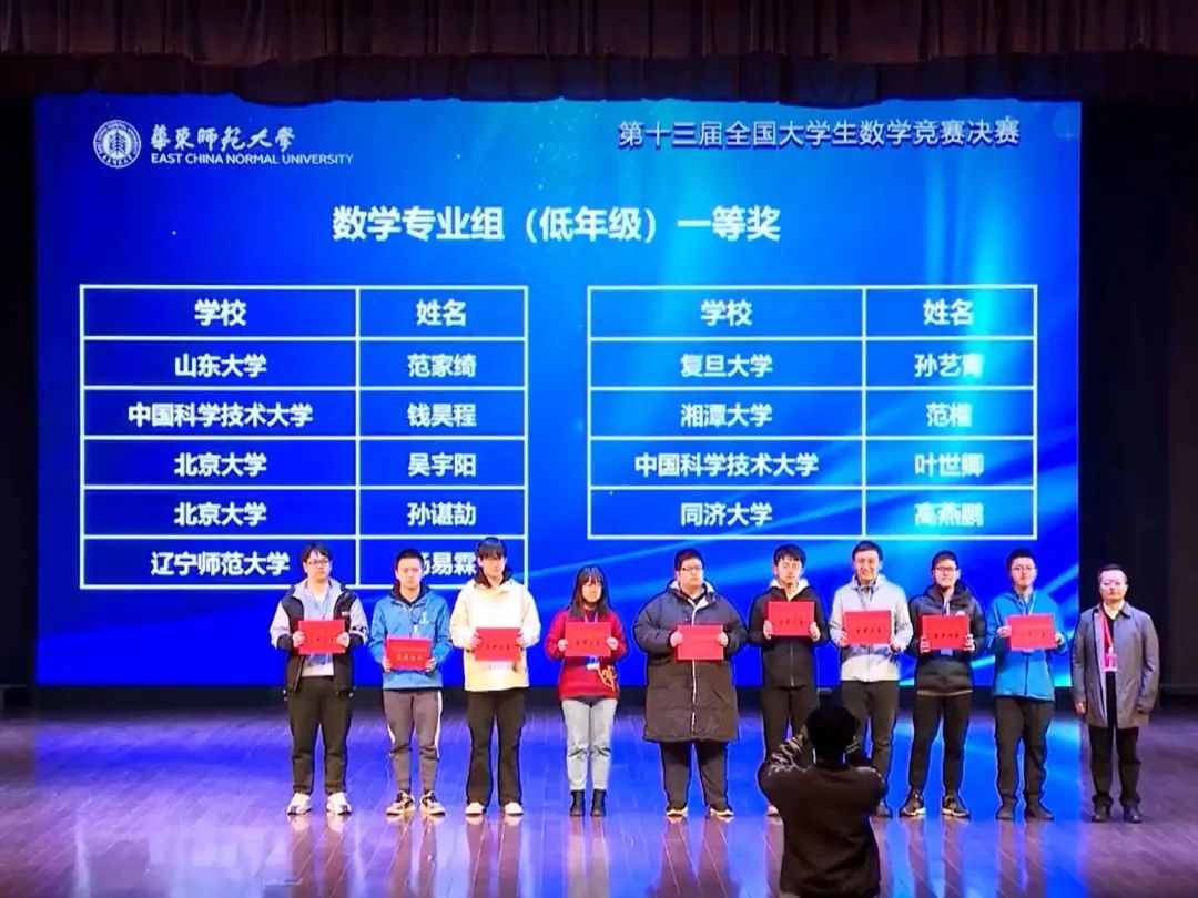 2023年3月25日,由中国数学会主办,华东师范大学承办的第十三届全国大学生数学竞赛决赛在华东师范大学(闵行校区)举行。我校学生共获得一等奖4个,二等奖6个,其中数学类低年级组一等奖3个,在全国并列第二。