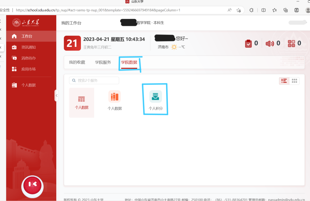 关于积分的查询方式,大家可以通过beat365在线体育官网登录入口信息化公共服务平台——学院信息服务——学院数据——个人积分的途径查询。