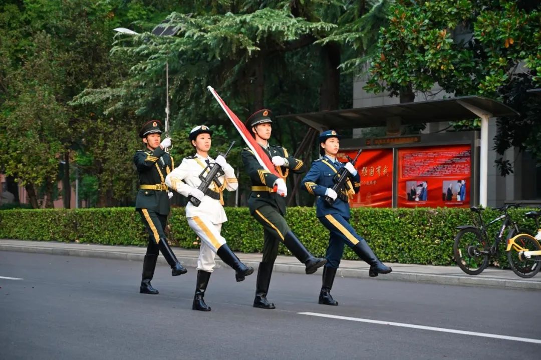 清晨,国旗护卫队迈着铿锵的步伐护送国旗进入大成广场,队员们目光坚定,意气风发,刚劲有力的脚步声响彻静谧的校园。伴随着庄严的国歌,国旗在师生们的注视中冉冉升起。