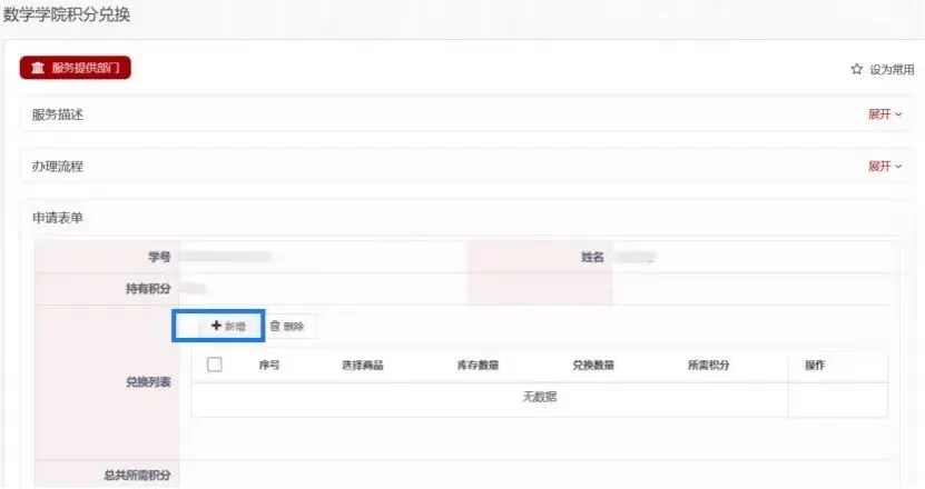 beat365在线体育官网登录入口信息化公共服务平台——右下角“常用应用”中找到“学院信息服务”——学院信息服务工作台——“学院服务”——“积分兑换申请”——“新增”,然后选择自己想要的商品名称,确定后就可以显示商品的种类和库存。