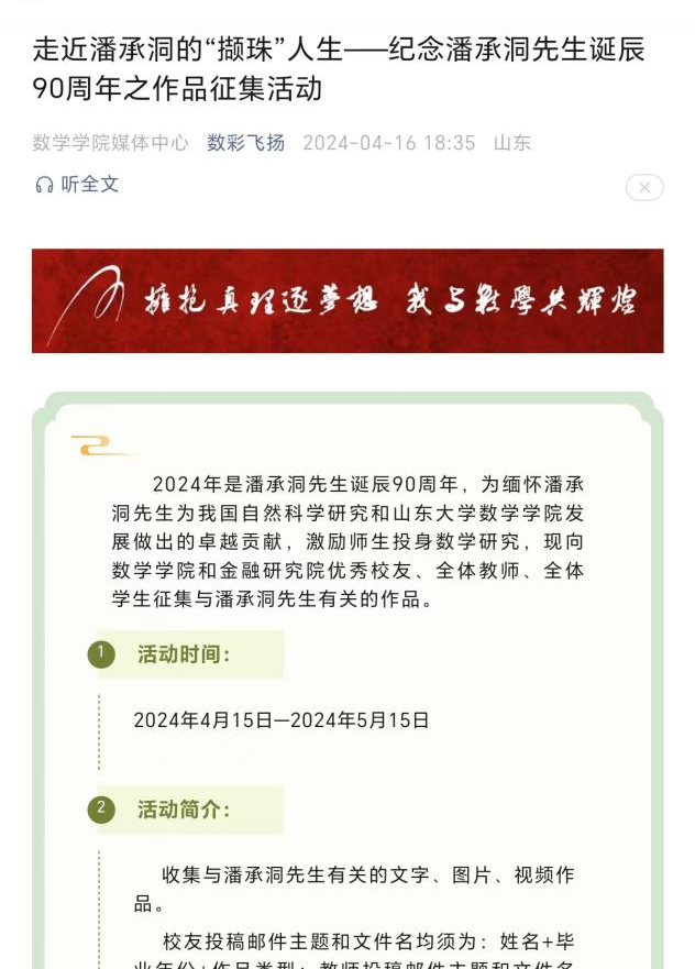 共赴学术盛宴,启迪数学新思。深挖学科育人资源,打造高水平立体式学术文化交流平台,营造浓厚学术文化氛围。院士领航,彭实戈院士讲述“我的数学探索之路”,照亮未来数学之星成长之路。专家学者、学术新秀围绕学科热点主讲“珠峰讲坛”“新星讲坛”等,数学文化节开幕以来累计举办30余期。丰富学术文化品牌体系,创办“潘承洞讲座”“数学一小时论坛”等,师生探讨学术前沿,激发创新热情。