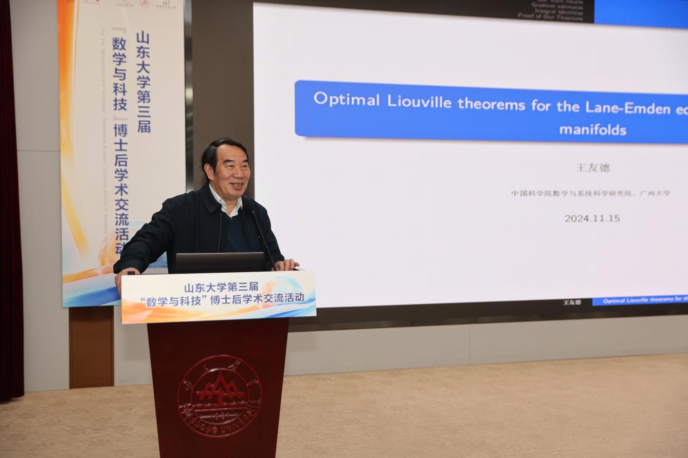 王友德研究员作了题为“Optimal Liouville theorems for the Lane-Emden equation on Riemannian manifolds”的学术报告。他回顾了相关方程的研究历史,提出了当前研究的问题及团队的主要结果,并详细讲解了研究的基本思路和方法,包括梯度估计、积分恒等式等内容。