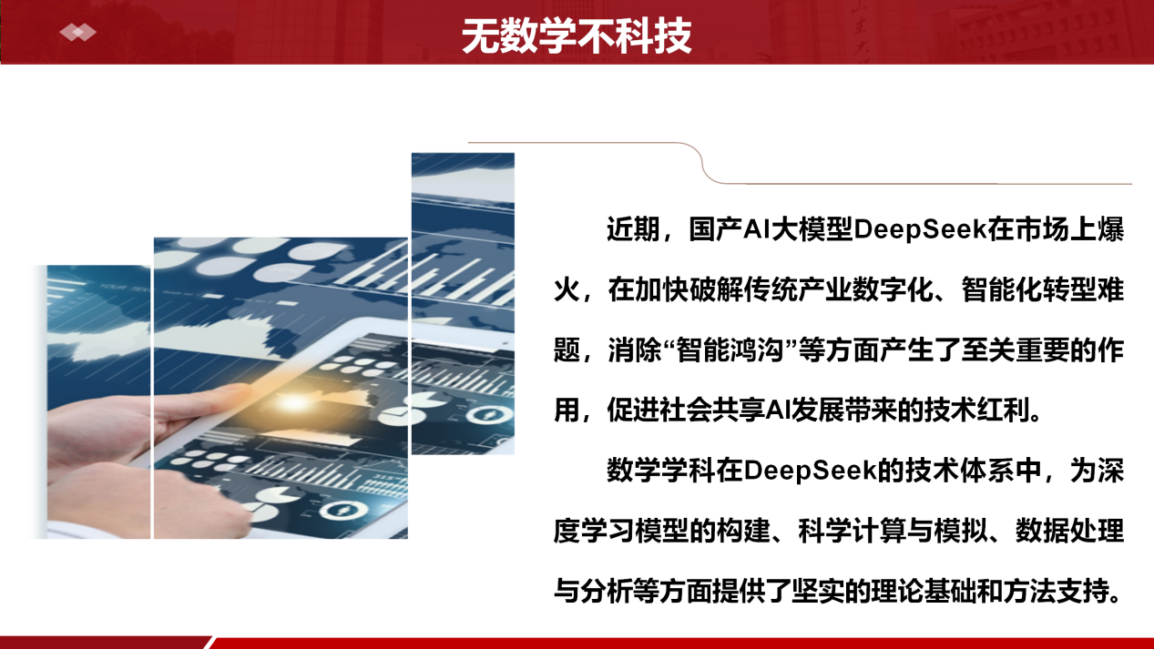 突出数智赋能,培育时代新人。瞄准世界科技前沿和国家重大战略需求,加快数学拔尖创新人才培养,推进人工智能赋能教育管理改革。突出“学科驱动”,开学各类专业课中强调数学学科尤其是在DeepSeek的技术体系中,为深度学习模型的构建、科学计算与模拟、数据处理与分析等方面提供了坚实的理论基础和方法支持,鼓励学生在基础学科领域大胆发问、善于思考、勇于探索。构筑全面学习氛围,形成“分管领导带头学、辅导员全面学、学生深度学”的数智教育,结合教育管理日常工作和学校对于DeepSeek软件应用开发效能,加强对新工具、新业态、新方式的应用,促进学生不断成为全面发展的时代新人。