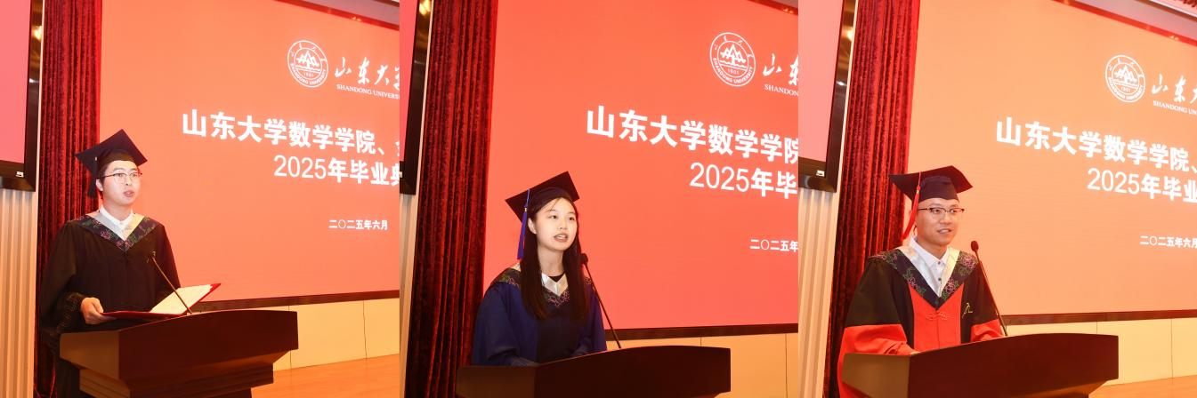 青春有为,强国有我。毕业生代表们回顾求学时光,感恩母校点滴。本科毕业生代表徐翔宇讲述了自己作为“小‘数’苗”成长的故事,激励同学们在祖国大地上谱写精彩人生的绚丽篇章;硕士毕业生代表黄文萱分享了自己在山大收获的“理性之光”“人文之暖”和“山大基因”,立志永攀学术高峰、努力服务国家;博士毕业生代表时洪鹏回顾了十年来的求学时光,表示在未来要将个人理想融入国家发展,传承“为天下储人才,为国家图富强”的使命担当。