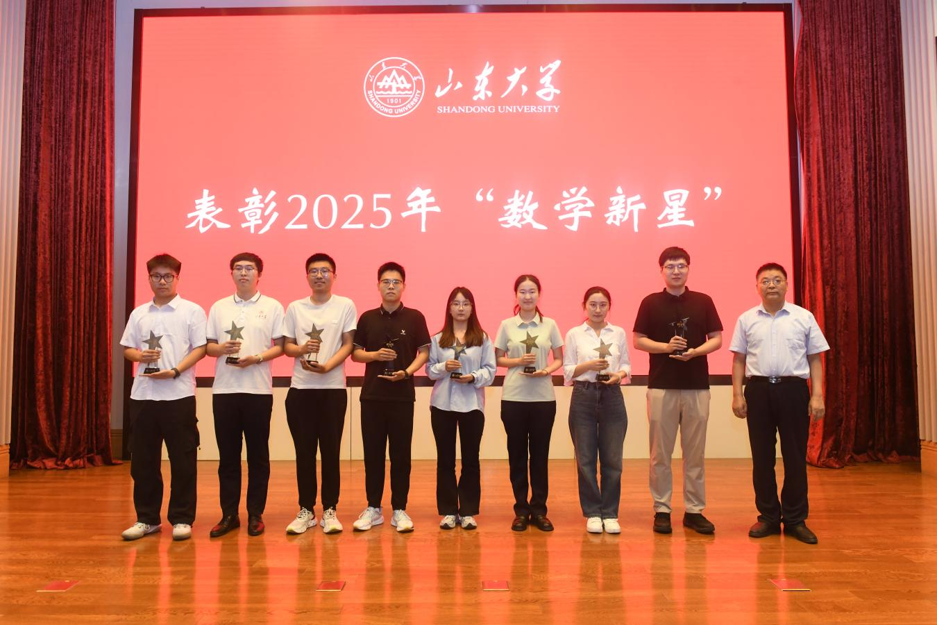 庄严的中华人民共和国国歌《义勇军进行曲》拉开了毕业典礼的帷幕。在典礼上,陈增敬宣读《关于表彰2025年“数学新星”的决定》并为他们颁发“数学新星”奖杯。王光辉为校友班级理事代表颁发聘书。