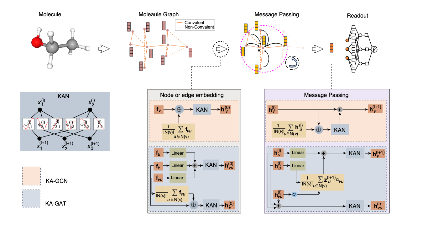 本研究提出了 Kolmogorov–Arnold 图神经网络(KA-GNN)模型,将Kolmogorov–Arnold网络引入图神经网络的核心计算环节,显著提升图信息处理的灵活性与表达力;结合傅里叶级数与注意力机制,不仅在预测准确率上保持领先,还能精准识别化学意义明确的关键子结构,其解释结果与化学知识高度吻合。