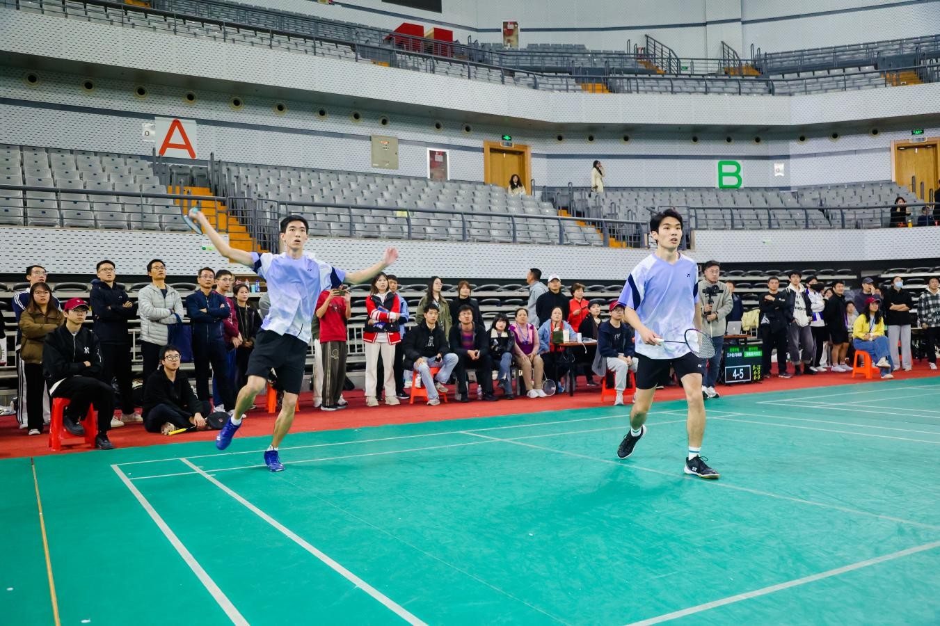 决赛对阵管理学院,我方三对组合同时上场,瞬间将现场气氛推向高潮,场边加油助威声如山呼海啸震耳欲聋。冯晨悦和杨晨打出完美配合,11:3和11:2轻取对手。转到男双赛场,配合愈发默契的白鑫桐和张嘉灏出手果决,敢打敢拼,以12:10和11:5的比分将冠军收入囊中,全场为之沸腾。